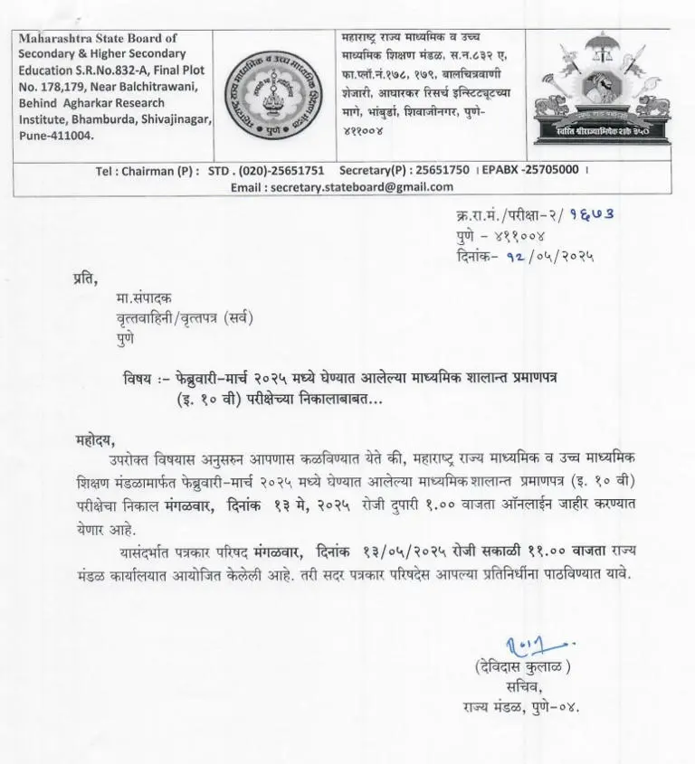 बोर्डाचे सचिव देविदास कुलाळ यांच्या स्वाक्षरीने प्रसिद्ध करण्यात आलेल्या पत्रकात, फेब्रुवारी-मार्च 2025 मध्ये पार पडलेल्या माध्यमिक शालान्त प्रमाणपत्र परीक्षेचा निकाल आज ऑनलाईन स्वरूपात जाहीर केला जाणार असल्याचं स्पष्ट करण्यात आलं आहे.