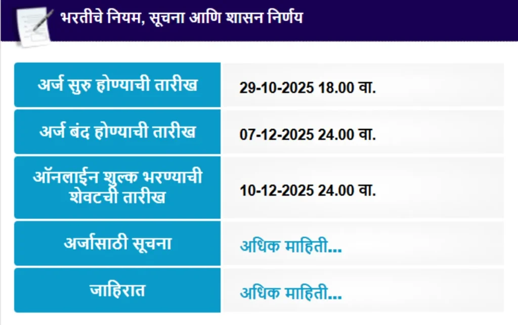 अनेकदा अंतिम दिवशी सर्व्हर डाऊन होणे, संकेतस्थळ धीमे होणे अशा समस्या उद्भवतात. त्यामुळे अर्ज शेवटच्या दिवशी न करता शक्य तितक्या लवकर पूर्ण करण्याची विनंती विभागाने केली आहे. भरतीसंबंधी पुढील अद्यतने व सूचनांसाठी अधिकृत संकेतस्थळाला नियमित भेट द्यावी, असेही सांगण्यात आले आहे.